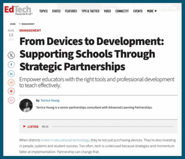 In From Devices to Development: Supporting Schools Through Strategic Partnerships, Senior Partnerships Consultant, Terrica Young, Ed.D, GRI draws on her experience with ALP and our partnership with CDW to explore how schools can move beyond simply purchasing devices to creating lasting impact through technology.