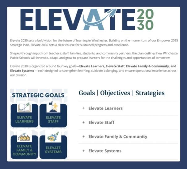 Students from diverse backgrounds with unique needs rely on Winchester Public Schools to not only prepare but to empower them to thrive in a rapidly changing world. The Division’s strident focus on achieving equity for all learners and bolstered by its vision, mission, and Elevate 2030 goals. Elevate 2030 builds on the momentum of the Empower 2025 Strategic Plan and sets a clear course for sustained progress and excellence Goals.