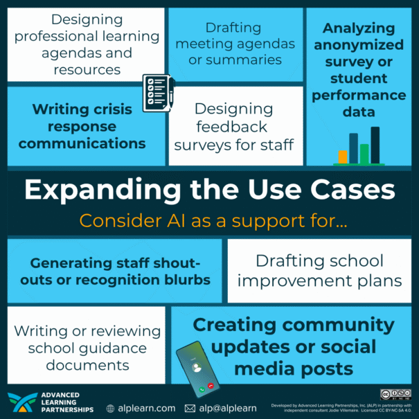 As principals grow more comfortable with early use cases of AI support with communication, I lead them to explore other possibilities where AI can support their complex leadership role. I invite them to consider AI as a support for the following tasks: