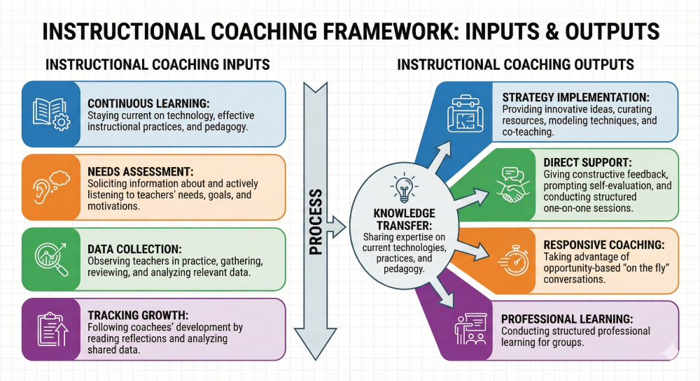 Instructional Coaches and Instructional Technology Coaches operate in a demanding environment that requires constant investment in their expertise. While their primary focus is on the crucial output of supporting teachers, they also need to focus on continuous input for their own growth. Small group coaching serves as the essential fulcrum, providing a structured, supportive, and collaborative professional learning community. By practicing key skills like role-playing and feedback, setting personal goals, and dedicating time for reflection, coaching group participants can solidify their roles, enhance their confidence, and ensure they are using the most effective, research-backed practices. This vital investment in their own development is more than a benefit; it is a necessity that ultimately equips coaches to maximize their impact on teacher capacity and, consequently, on student achievement.